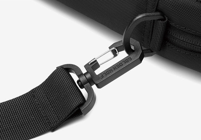 - بيئة العمل - مقبض مزدوج مريح مع زر ، قابل للتعديل بطول حزام الكتف على carabiners وحزام للتثبيت بمقبض حقيبة السفر.