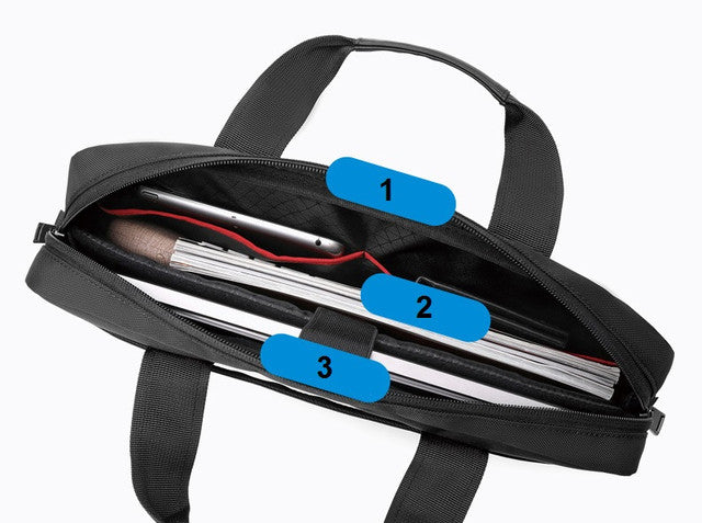 - المقصورة الرئيسية على السوستة لجهاز كمبيوتر محمول يصل حجمه إلى 15.6 بوصة (37 × 27 سم) مع تنجيد ناعم وحشيات لامتصاص الصدمات وحزام مطاطي للتثبيت وجيبان مفتوحان متوسط الحجم.